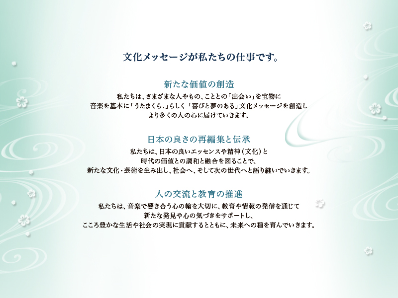 主な事業 | 音楽制作 / 舞台製作 / 教室運営 / ピアノ調律・修理 / 輸入鍵盤楽器の販売 / CD・音楽教材などの商品企画、販売 |