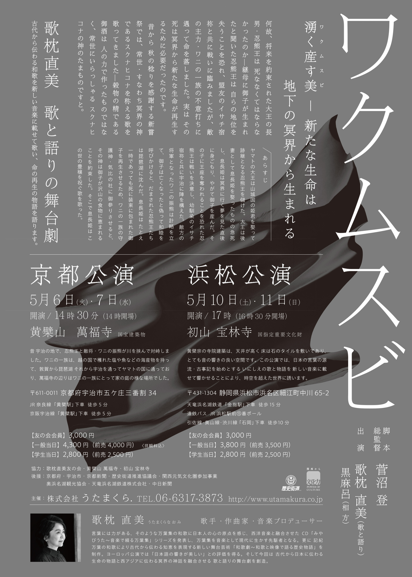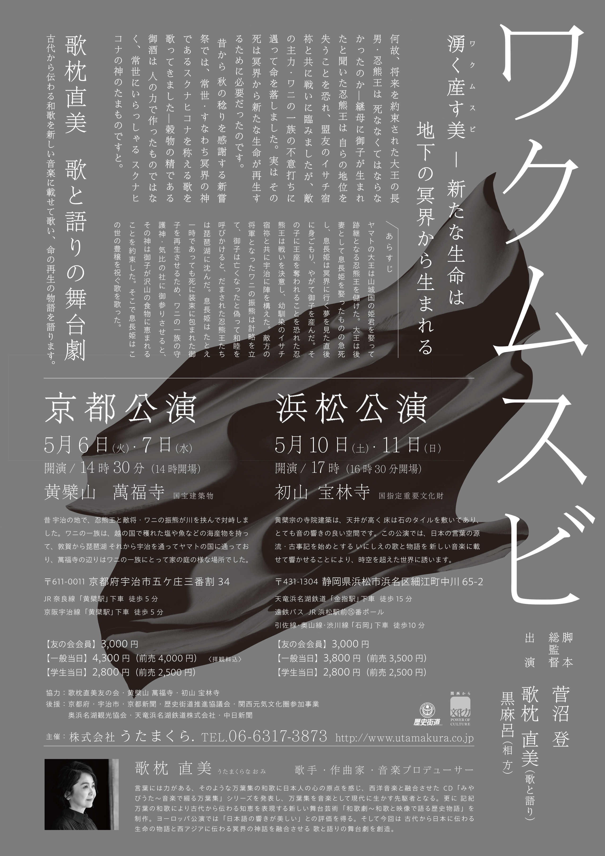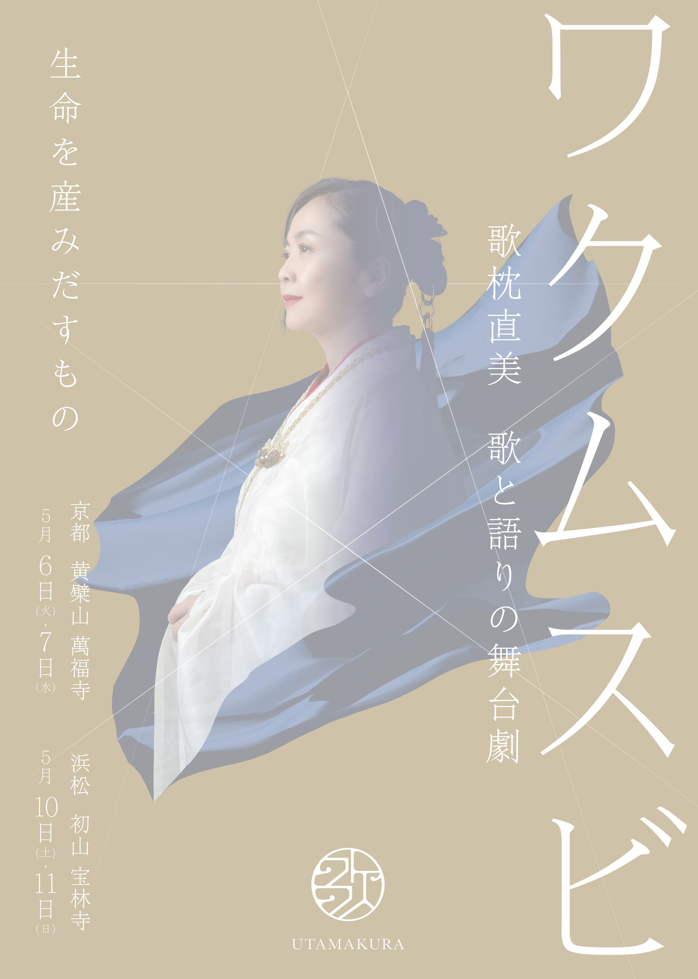 古事記うたものがたり 作品紹介 「ワクムスビ 」 歌枕直美 歌と語りの舞台劇 「ワクムスビー新たな生命は地下の冥界から生まれるー」 -公演実績- 2025年5月6日・7日 黄檗山 萬福寺 法堂 2025年5月10日・11日 初山 宝林寺 本堂