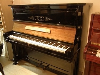 戦前のピアノでドイツで製造されました。創業は1849年でヨーロッパの中で古いメーカーの一つです。デザインに気を配り、最近までも凝ったデザインのピアノを出しています。このピアノも天板の内側に木目の木地が見えそこに博覧会などで取ったメダルの数々が描かれています。
