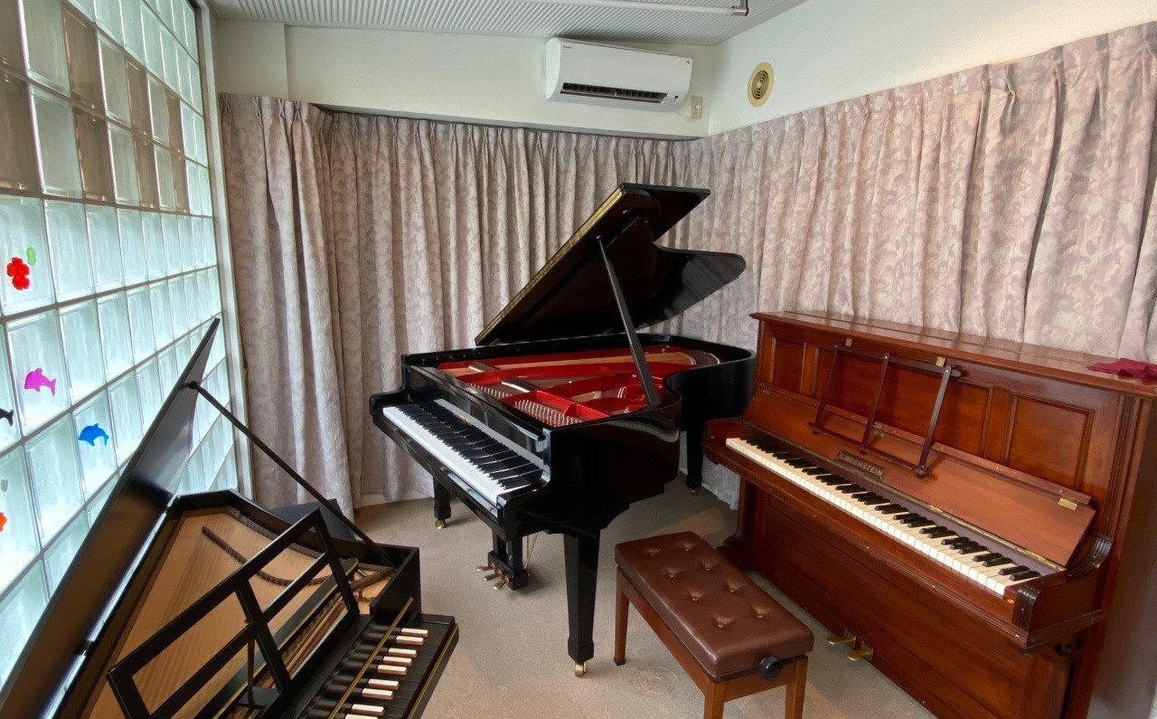 ピアノの修理・調整を行っているピアノ工房の中にレッスン室あります。レッスン室に入るまでに修理風景が見え、子供だけではなく、大人の方も興味を持てる空間です。