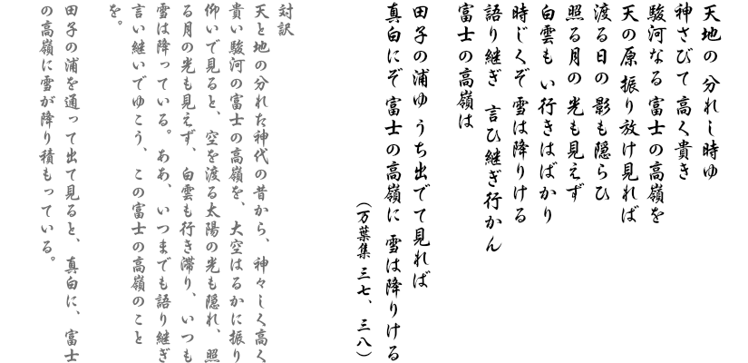 富士山の麓にある駿河の国には、その山から生ずる清らかな湧き水により、豊かな農作物の稔りがあった。その国に住む一人の若い男が、毎晩 険しい峠を越えて、隣の集落(地区)に住む恋人の家に通っていた。やがて二人は結婚し、子供も生まれた。ところが、朝鮮半島で戦争が勃発すると、そこに縁の深い駿河の大王は、自ら防人(兵士)を率いて、戦地に赴くことになった。駿河の大王は、一万人もの防人を徴発(動員)したが、その峠を越えていった若い男も徴発された。見知らぬ国に旅立つことになった その若い男は、父母に別れの挨拶として和歌を詠み(作り)、最後に 最愛の妻と二人で眺めた富士山の歌を詠んで、故郷に別れを告げた。