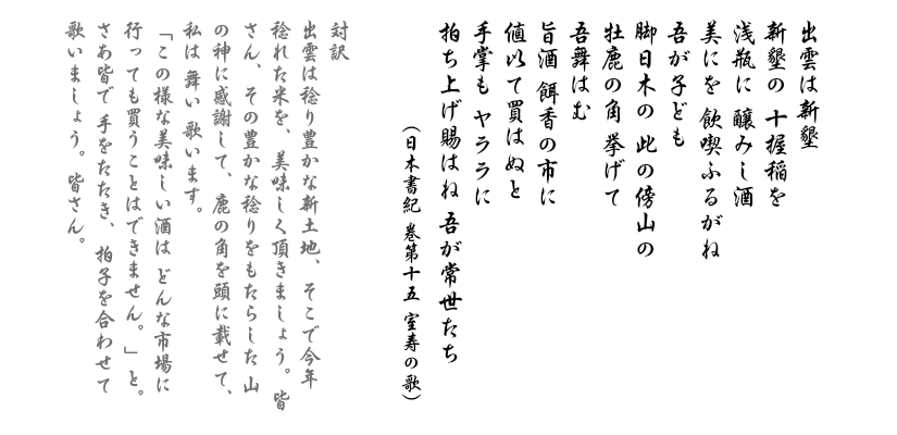 出雲の国の主となったオオナムチは、更にその版図を広げるため、東の方に進出した。翡翠の玉を産出する越の国の女王・ヌナカワ姫の宮殿に着いたオオナムチは、自らの国の作法に従い、深夜 ヌナカワ姫の部屋に入ろうとしたが拒否されたため、彼は怒りの歌を歌った。一方、遠い昔から出雲の国と覇権を争っていた越の国には、古い伝統があった。その女王・ヌナカワ姫は、洗練された鉄の武器を持って進出してきたオオナムチに対し、例え武力では叶わなくても、自分たちの伝統には従わせようとした。彼女はオオナムチの求婚に対し、越の国には 新婚初夜に夫婦は床を共にしてはいけないという作法があるので、明日の夜まで待つ様にと歌で答えた。この様にして、オオナムチが日本中を巡り歩き、鉄の道具を作る技術を教えて廻ったお陰で、人々は、お米という安定した食物を得ることが出来る様になった。