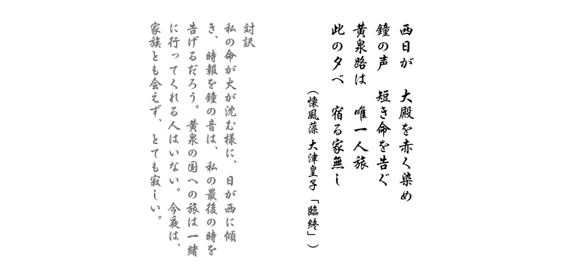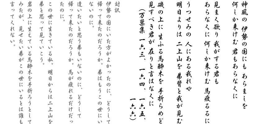 天武天皇の皇子の中で、大津皇子は武芸にも詩歌の道にも優れ、跡取りの最有力候補だった。一方、腹違いの弟・草壁皇子は病弱であったが、その母・鵜野皇后は計略により、大津皇子を陥れようとした。そこで大津皇子は、伊勢の宮に仕えている姉・大伯皇女に会って助力を頼むが、皇女は動かなかった。大津皇子が短い生涯を終えた後、ヤマトの国に戻った大伯皇女は二上山に寄せて弟を想う歌を詠んだ。